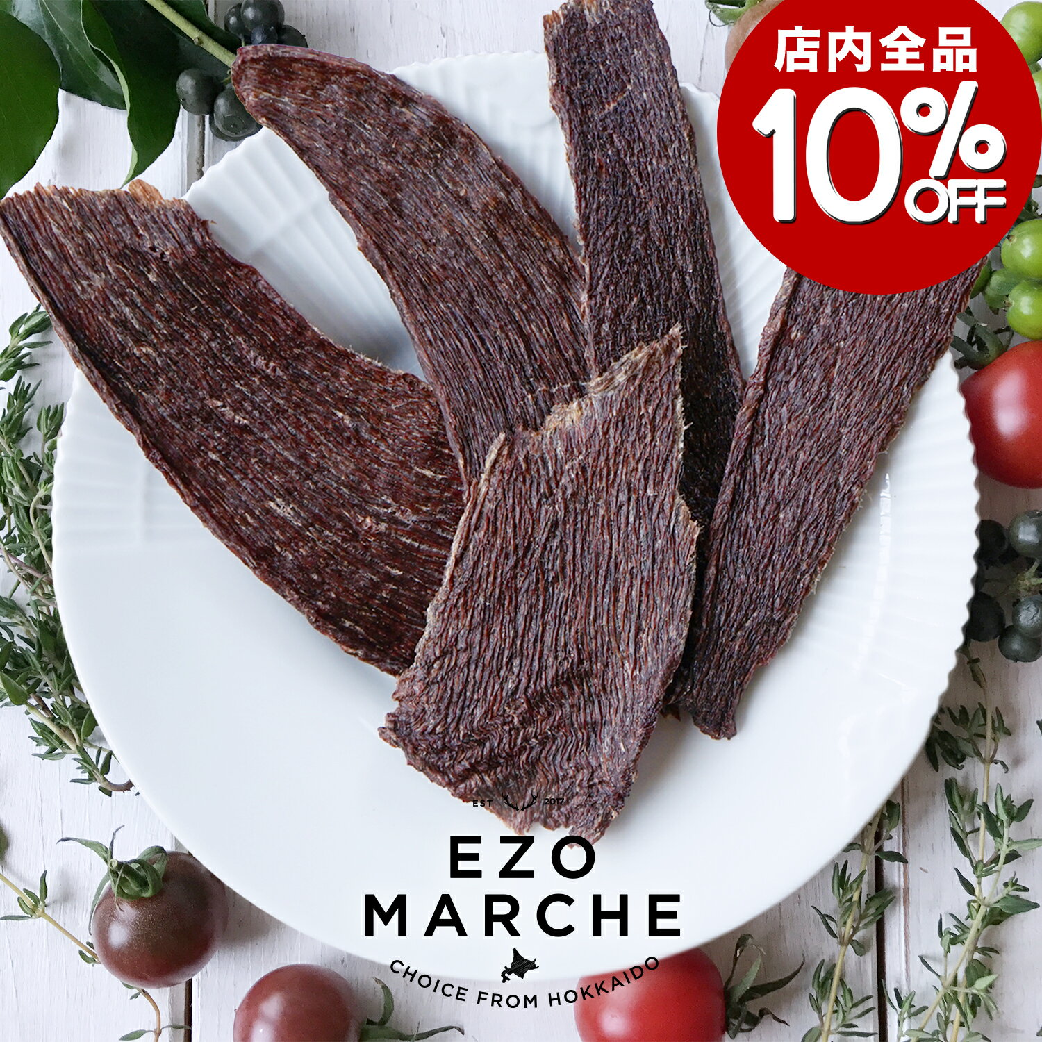 エゾ鹿スライスジャーキーはエゾ鹿の上質なモモ肉だけを使い筋や脂を丁寧に取り除いたサクサク食感。